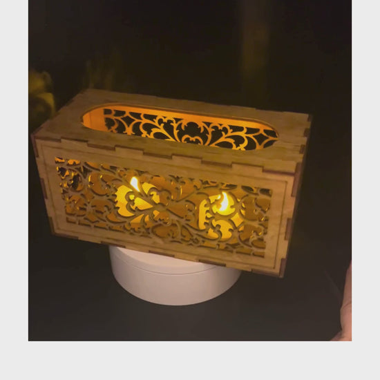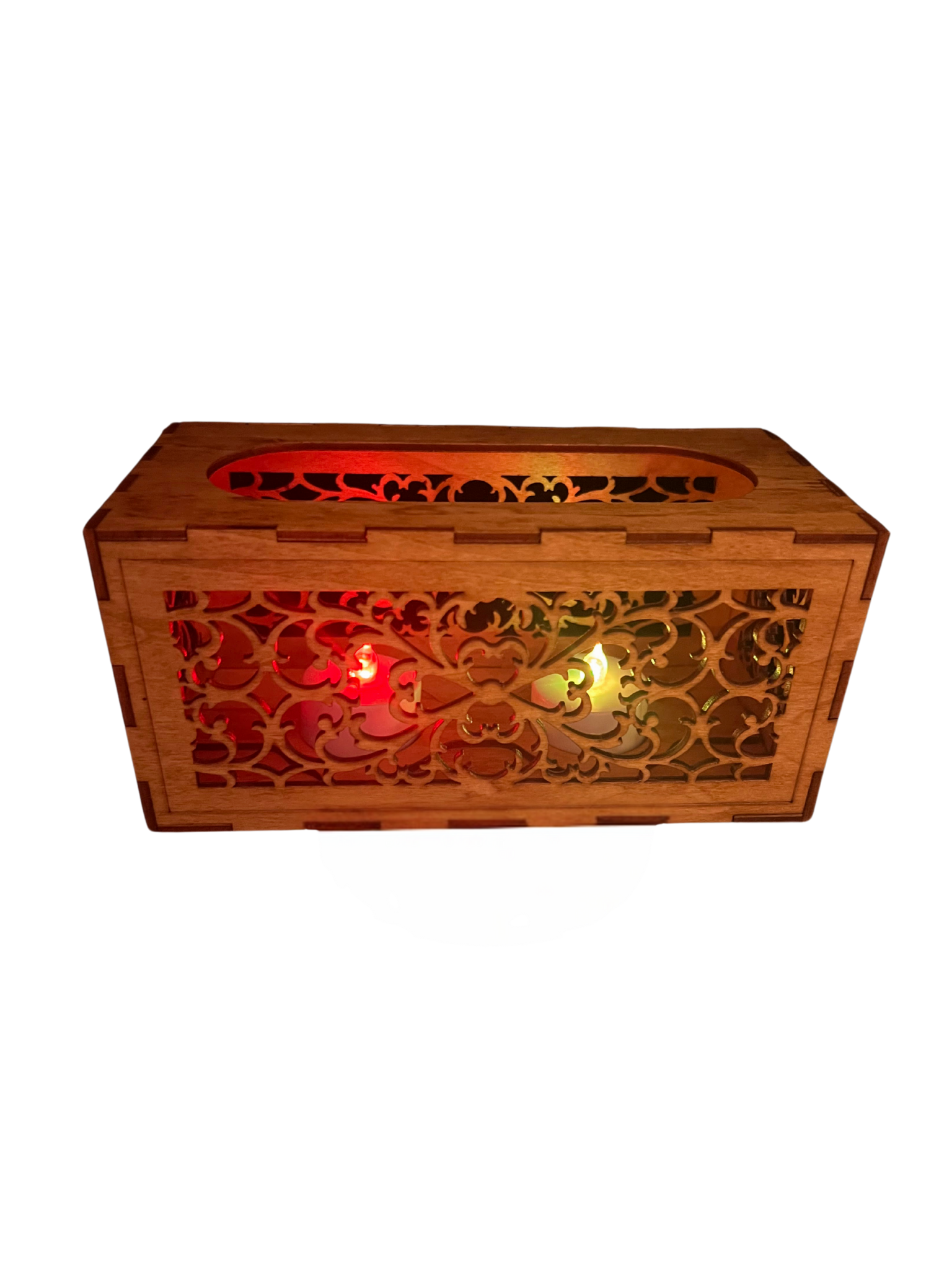 Elevate your space with this double candle holder, featuring an ornate design and precise laser engraving. Finished in a warm golden oak stain, it creates a glowing ambiance that enhances any room. Perfect for adding a touch of elegance and warmth to your décor.